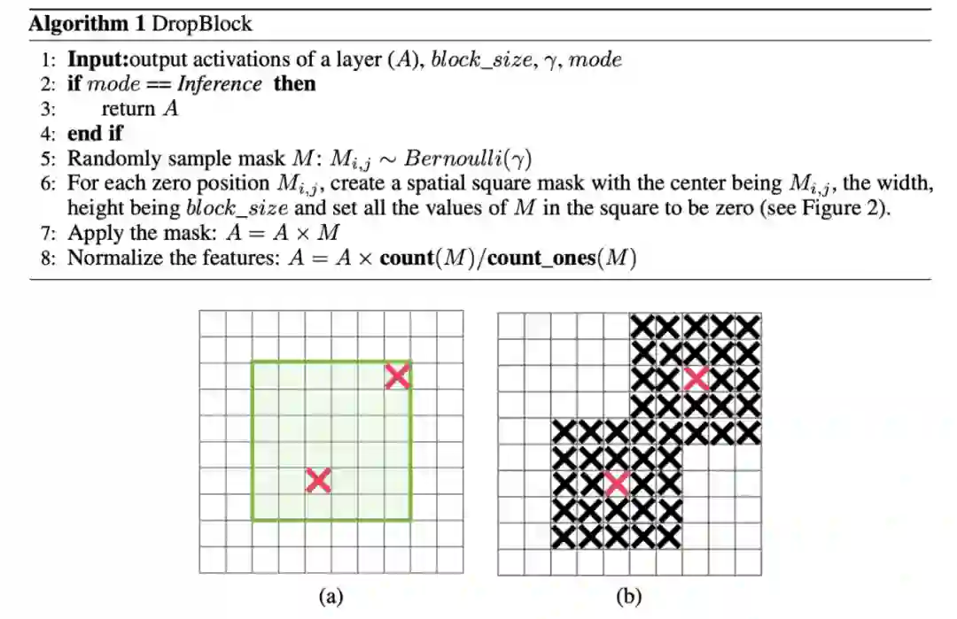 不过 DropBlock 丢弃的不是各个像素,而是大小为 block_size × block_size 的一个像素块。