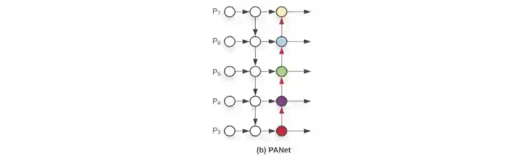 下图是用于目标检测的路径聚合网络(PAN)。其中,自底向上的路径得到增强,使得低层信息更容易传播到顶部。在 FPN 中,局部空间信息会向上传播,如红色箭头所示。尽管图中可能没有展示清楚,但这条红色路径穿过了大约 100 多层。PAN 引入了一个捷径路径(绿色路径),其仅需 10 层左右就能抵达顶部的 N₅ 层。这个短回路概念使得顶层也能获取到细粒度的局部信息。