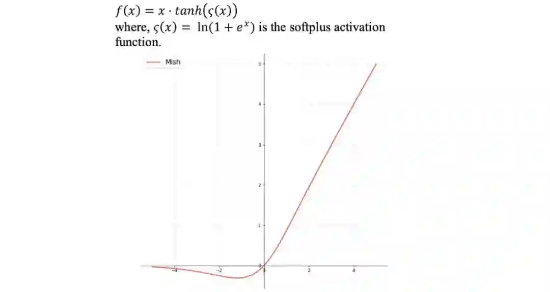 Mish 是另一个与 ReLU 和 Swish 很相似的激活函数。Mish 的论文(arXiv:1908.08681)宣称使用 Mish 的深度网络在许多不同数据集上的表现都更优。