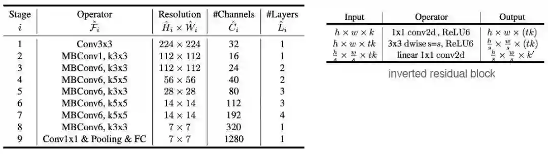 为便参照,下面给出了基于 MBConv 层构建的 EfficientNet 的架构,这些层由反向残差模块组成。
