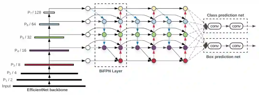 YOLOv4 比较了其与 EfficientDet 的表现,而后者被认为是目前最先进的技术之一。我们来看看这种技术。如下所示,EfficientDet 以 EfficientNet 作骨干,以 BiFPN 为颈部。