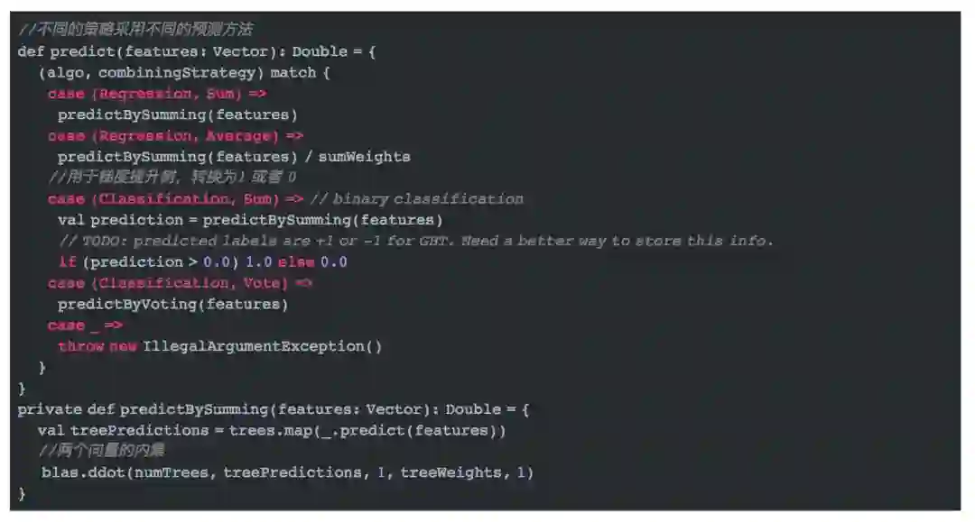 利用梯度提升树进行预测时,调用的predict方法扩展自TreeEnsembleModel,它是树结构组合模型的表示,其核心代码如下所示: