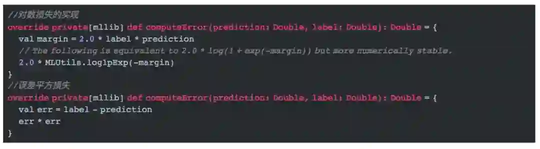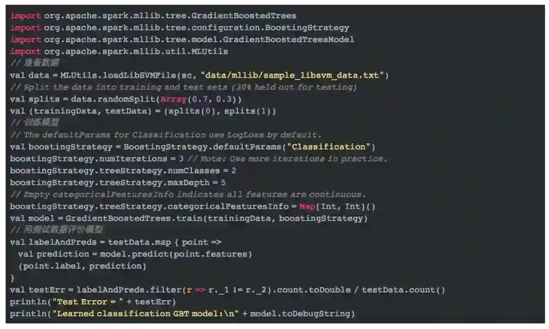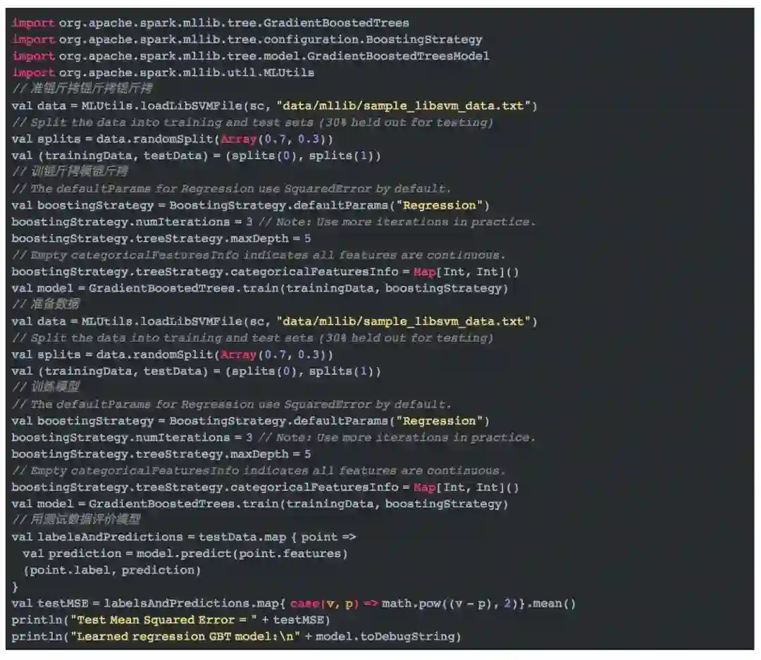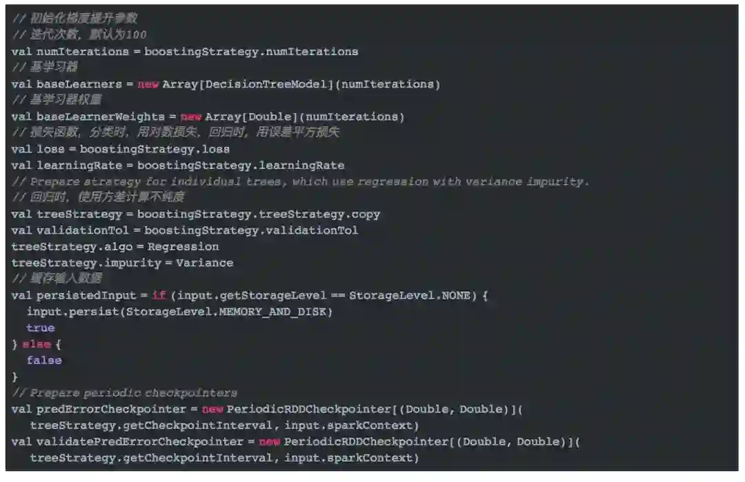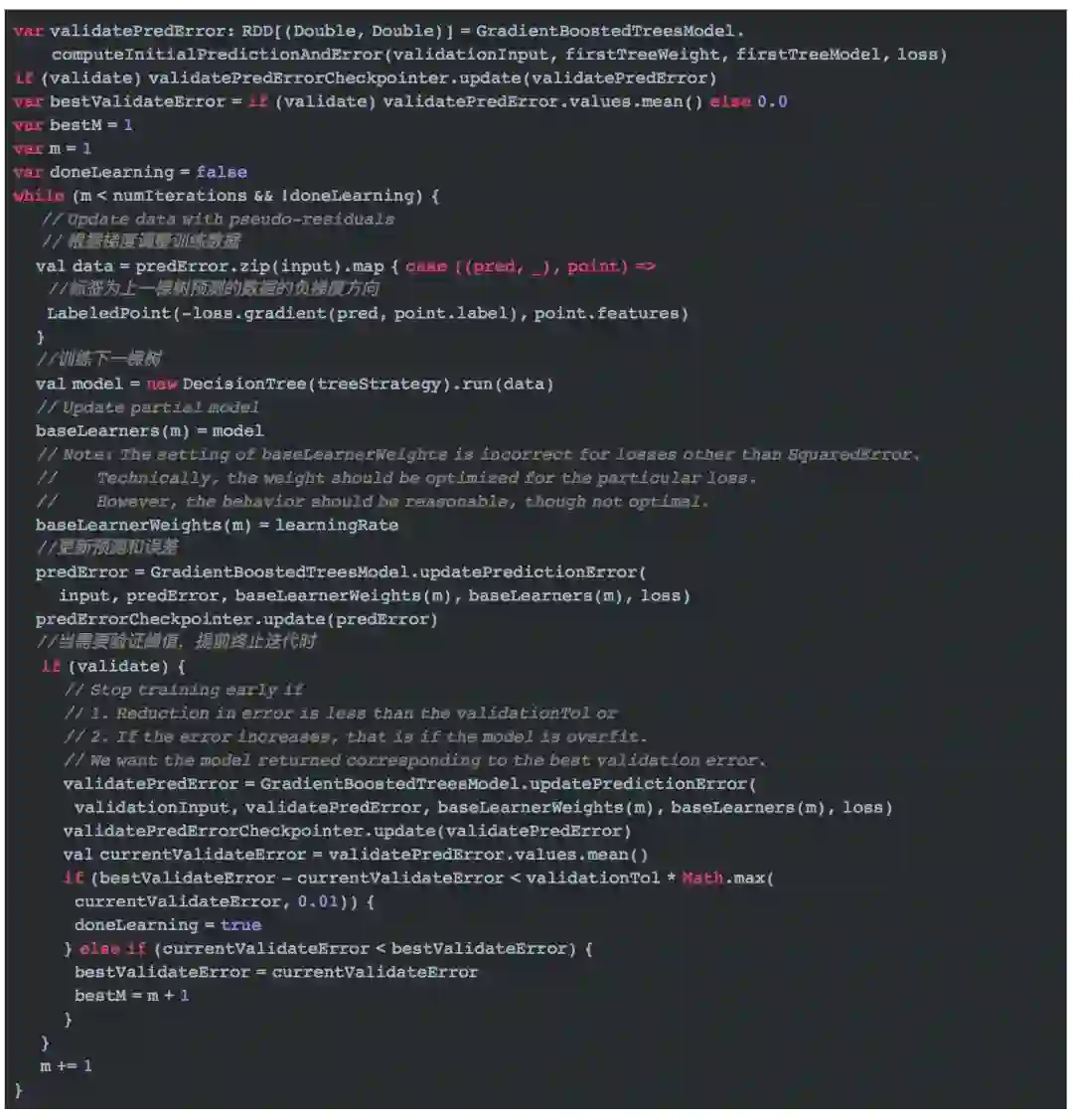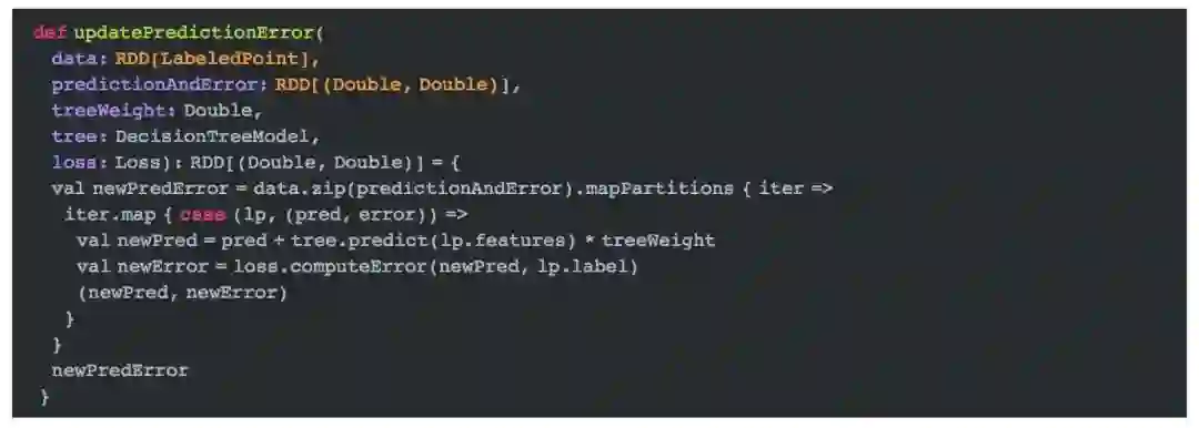 上面代码最重要的部分是更新预测和误差的实现。通过GradientBoostedTreesModel.updatePredictionError实现。