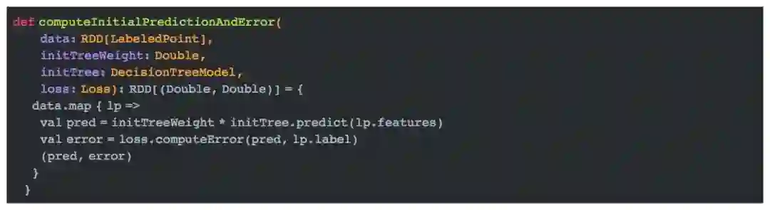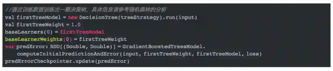 这里比较关键的是通过GradientBoostedTreesModel.computeInitialPredictionAndError计算初始的预测和误差。