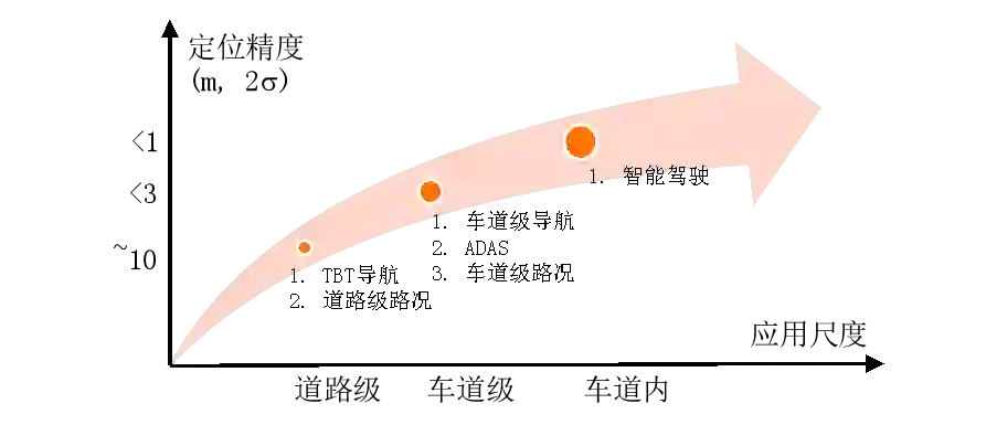 传统的导航定位仅需要解决道路级的定位问题,对定位精度的要求不高。但随着辅助驾驶、自动驾驶等越来越多的应用场景出现,对定位精度的要求也不断提高,如下图。