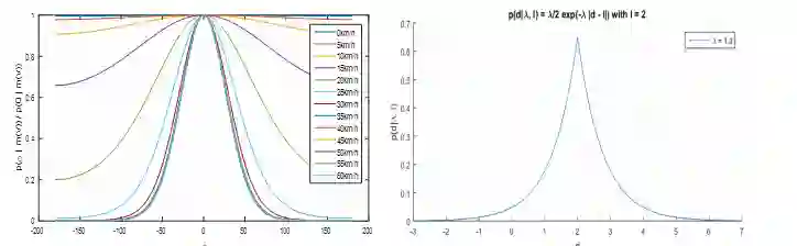 道路转弯的角度越大,速度较大的概率越低。采用Von Mises分布,以速度为超参数建立模型。根据车速和时间差计算移动距离,该距离和路径移动距离越接近,概率越大。采用指数分布建立模型。