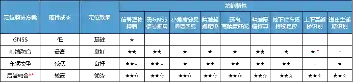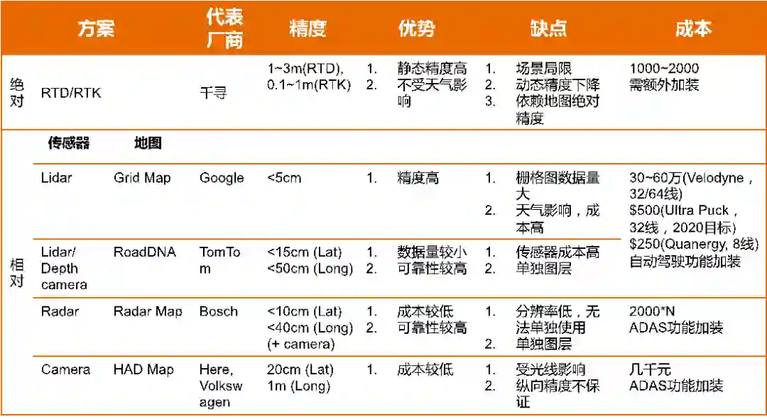 为达到更高精度的定位能力,需要对现有的定位手段进行升级。一种升级的方法是,对现有的定位输入源直接升级,如普通GPS升级为更高精度的RTK-GPS,低成本MEMS惯导升级为高精度惯导,这样可以在基本不改变原有算法框架的基础上直接获得高精度的定位能力。但缺点是,原有算法的缺陷,如长时间GPS丢失场景的累积误差问题依然存在,且成本较高。另一种方法是引入新的定位源,如激光雷达、毫米波雷达、摄像头等。这就需要针对这些新的传感器开发新的融合定位算法。不同的高精定位方案对比如下表。