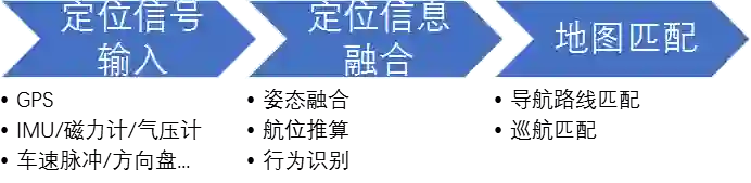 对于车机,通过CAN总线获取的车速脉冲、方向盘转角等信息是另一类重要的定位输入。基于上述定位信号,应用姿态融合、航位推算等算法,计算出连续可靠的位置和姿态。再依据地图数据将人/车的实际位置与地图道路关联,实时判断当前是否已经偏离导航路线,或更新当前在导航路线中的相对位置。