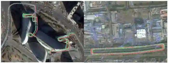 下图展示了采用后端融合方案的车机导航定位效果。图中蓝色是GPS位置,红色是高精度基准设备的定位轨迹,绿色是车机导航定位轨迹。可以看到,在GPS被遮挡的停车场,或GPS被干扰的区域,车机导航定位始终可以持续稳定的输出高精度的定位位置,保证了车载导航功能的可靠运行。