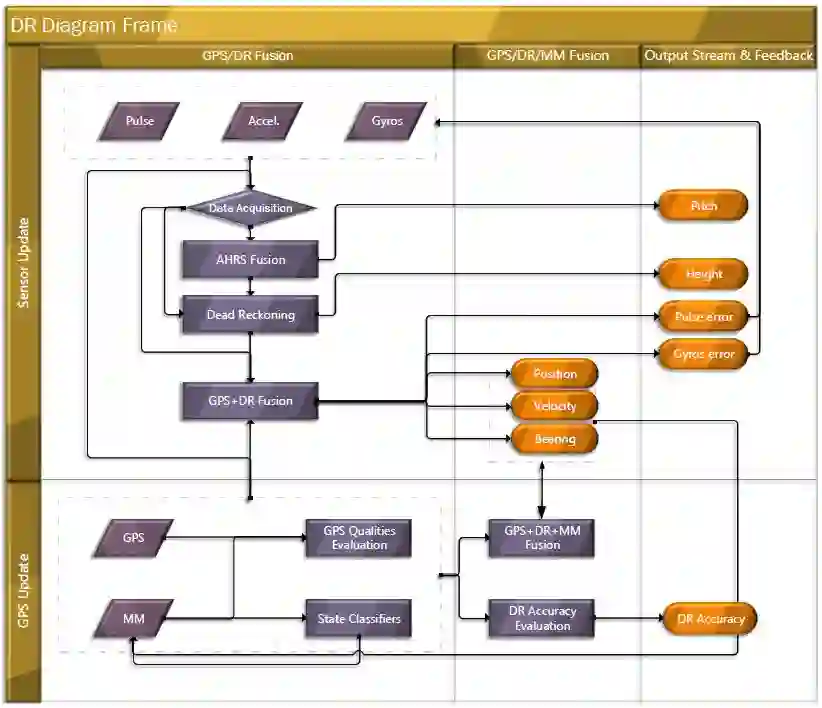 对于车机,只存在驾车使用场景。同时,由于车机具备稳定的安装状态并可以提供更丰富的车辆CAN总线信息,基于这些信息设计航位推算及融合算法,解决隧道、高架、平行路等复杂场景的连续定位问题是车机定位的重点。