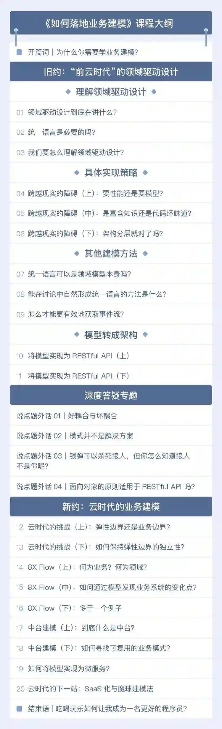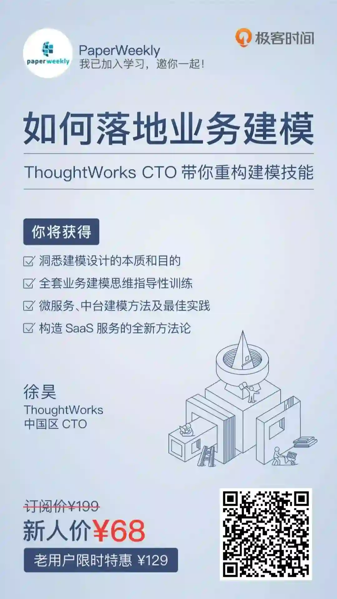 用战术上的勤奋掩饰战略上的懒惰,只会与原定目标背道而驰。这门课的内容和徐昊老师本人一样硬核。相信你看完,也能快速重构建模技能,掌握业务建模精髓和切实有效的落地方法论。哪怕仅仅作为一种思维训练法,这门课也是值得你学习的!
