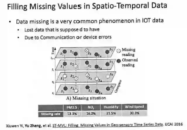 第二个,偏理论的例子。我刚才说数据会缺失,要填补,怎么填补?这是一个非常基础的问题,几乎我们做所有的机器学习的人在第一步拿出数据的时候会发现,这个数据质量不好,有一些缺失。可能传感器坏了,或者数据没传过来。我们拿的很多数据都是有缺的,气象数据有缺的,空气质量有缺的,甚至包括车联网里面数据很多都是会出现残缺的,怎么填?这是一个很重要的问题。