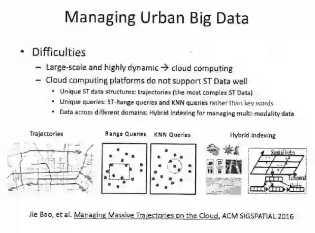 回到我们的城市计算第二个层面,刚刚讲了城市感知层面,我们要看城市数据管理。要管好城市大数据就是三方面的东西,第一,时空数据,这是时空的属性,不是一般的文本,也不是视频。第二,就是这种增强性的云平台,不是普通的云平台。第三,时空的索引,就是查询和检索算法。