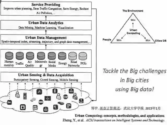 大家都知道我们现在生活越来越现代化,但是问题越来越多:交通拥堵、环境恶化、能耗增加。要解决这些问题在很多年前看似几乎不可能,因为城市设置非常复杂,环环相扣,牵一发而动全身,现在由于有了各种传感器技术的成熟和云计算单元的成熟,使得我们有各种各样的大数据,从社交媒体到交通流量,从气象条件到地理信息,如果使用得当的话,我们就能够用这些数据来发现城市面临的问题,并进一步通过组合这些数据来解决我们面临的挑战。基于这样的机遇和挑战,我们在2008年就提出了城市计算这样一个愿景,包括以下四个层面:从下往上(下图)有城市感知数据获取,城市数据的管理,城市数据的分析和挖掘到最后服务的提供。