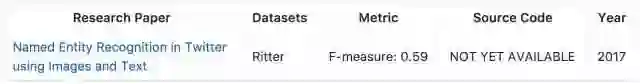 波恩大学 Diego Esteves 等研究者在推特上使用图像和文本进行命名实体识别,在该论文中,他们提出了一种新颖的多层级架构,该架构并不依赖于任何具体语言学的资源或解码规则。他们的新型模型在 Ritter 数据集上 F-measure 实现了 0.59 的优秀表现。