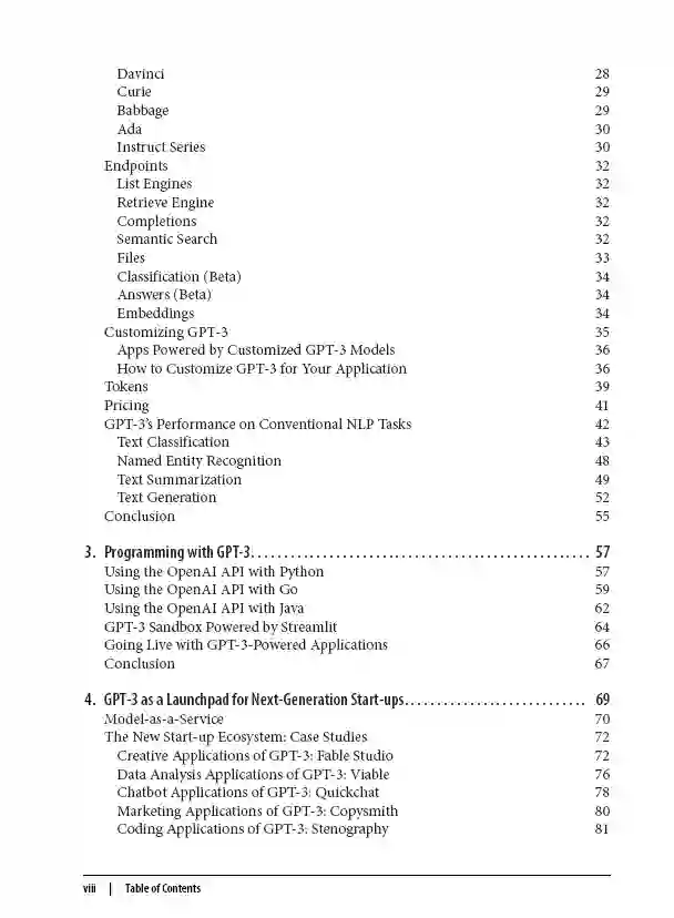 本书的第一部分涵盖了OpenAI API的基础。在本书的第二部分,我们探索了围绕GPT-3有机进化的生态系统。第一章列出了背景和基本定义,需要轻松地移动这些主题。在第二章中,我们将深入探讨API,将其分解为最重要的元素,如引擎和端点,为希望与它们进行更深层次交互的读者描述它们的目的和最佳实践。第三章为你的第一个基于GPT-3的应用提供了一个简单而有趣的配方。然后,将焦点转移到令人兴奋的AI生态系统,在第四章中,我们采访了一些最成功的基于GPT-3的产品和应用的创始人,他们的经验与该模式在商业规模上的互动。第五章着眼于企业如何看待GPT-3及其采用潜力。在第六章中,我们讨论了广泛采用GPT-3带来的问题,如误用和偏见,以及解决这些问题的进展。最后,在第七章中,我们展望未来,带领您了解随着GPT-3融入更广泛的商业生态系统,最令人兴奋的趋势和可能性。