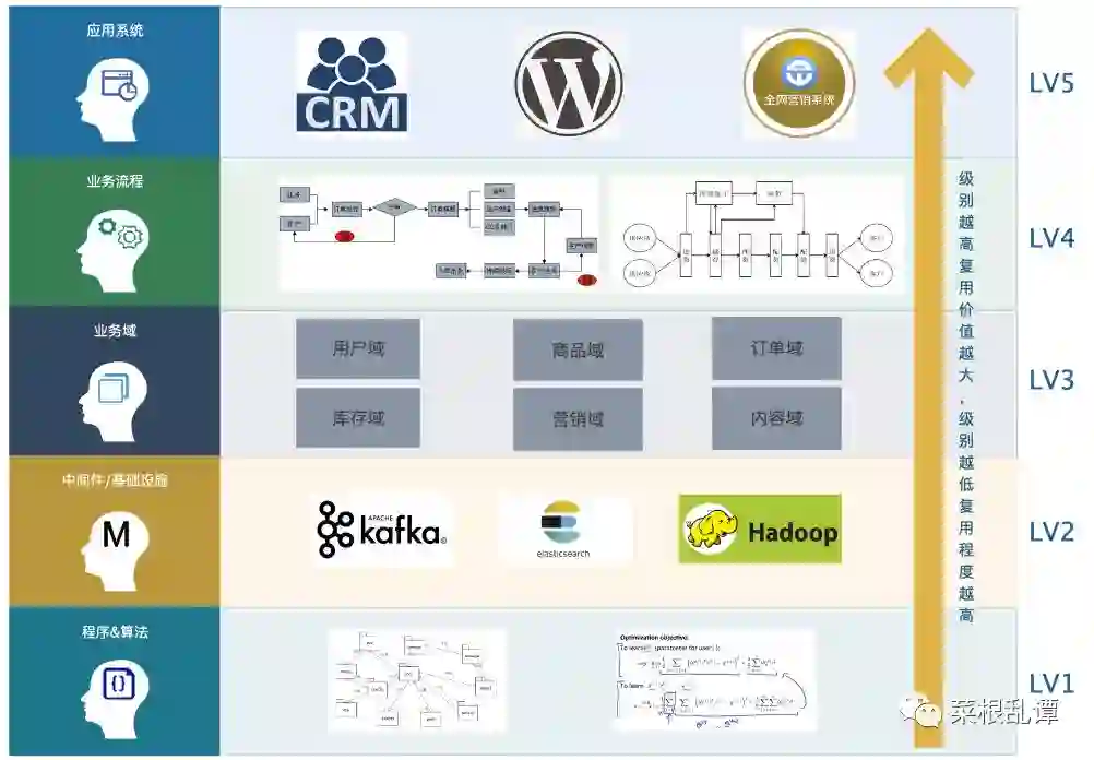 和阿里的朋友谈到复用时,我们也提到了复用的级别,像阿里云其实就是在基础设施这个级别上的复用。我自己把复用的级别抽象成下图所示的 5 层。