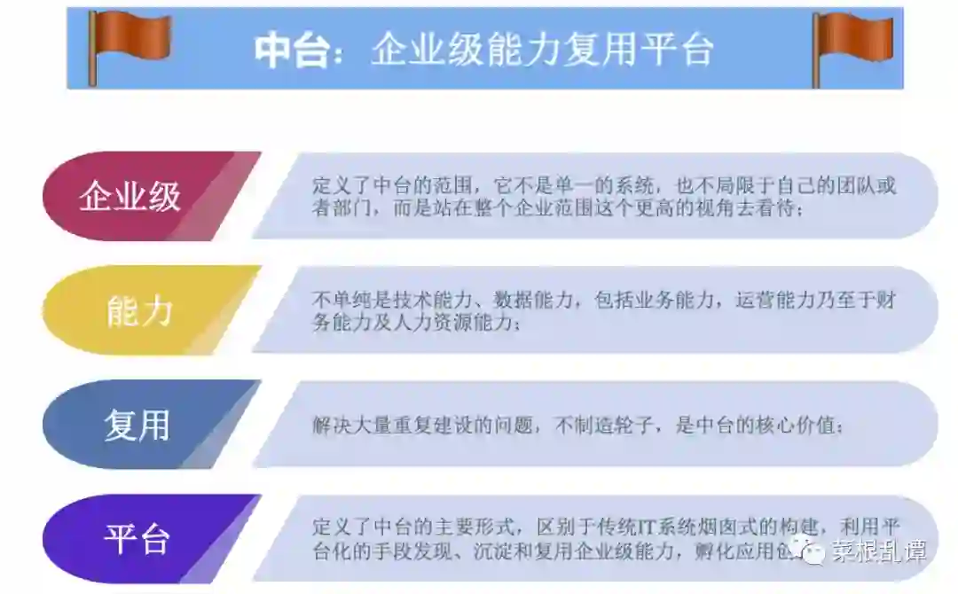 什么是中台?每个人可能有不同的理解,行业里也没有严格的定义,但我更认同其中一个说法就是:中台是企业级能力复用的平台。