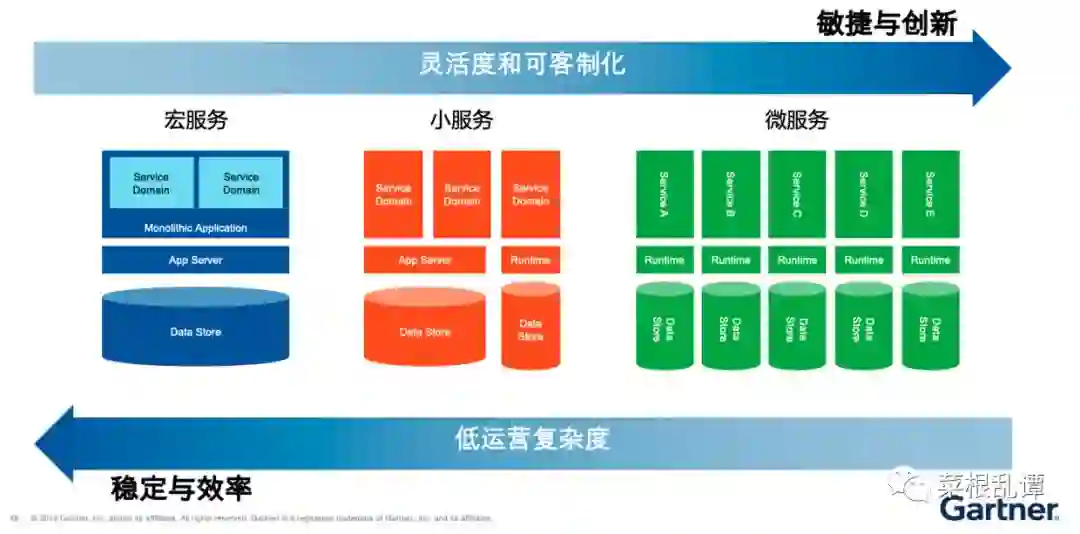 Gartner 在研究报告里提出了宏服务、小服务和微服务的粒度划分: