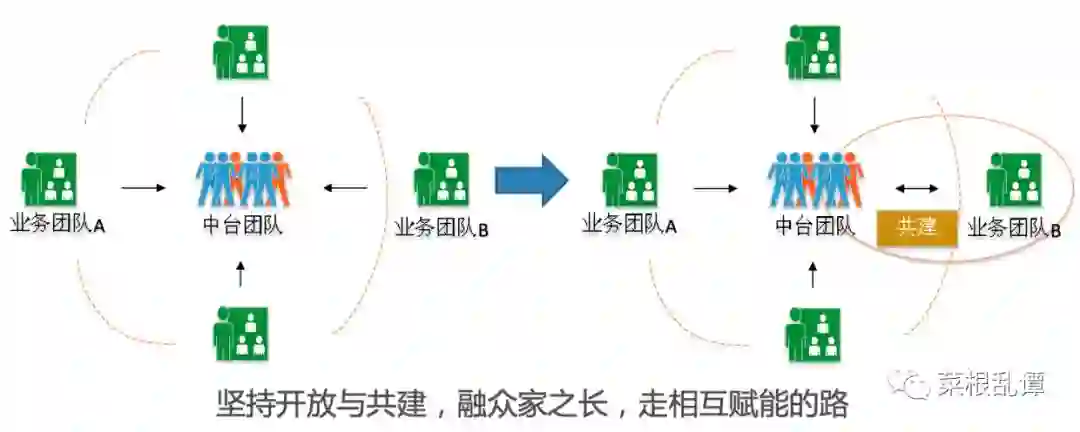 中台的建设是一把手工程,没有自上而下的推动,中台是很难落地的。所以中台变革的第一步就是组织架构的调整,需要建立一个中台团队来负责组织、协调和建设。