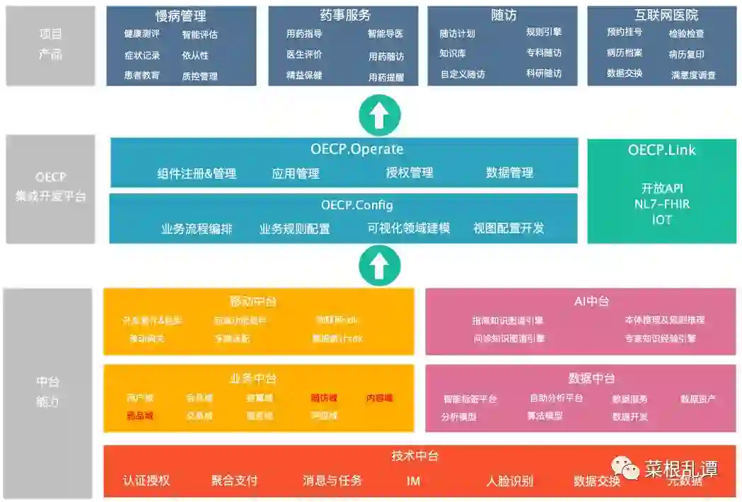中台首先要统一思想,围绕能力的复用进行组织管理,将能力组件化,如下图最底层部分;同时,中台之上我们要构建能快速落地的技术平台(如图中 OECP 部分),通过 Low code 的平台能力,实现组件的组装和流程的设计,快速的构建应用。
