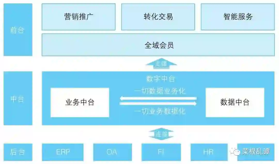 虽然各种中台很多,但是真正和业务保持密切协同的是业务中台和数据中台,阿里巴巴的中台核心也是这双中台驱动的,这里面体现的核心就是一切业务数据化,一切数据业务化,业务产生数据,数据又赋能业务。