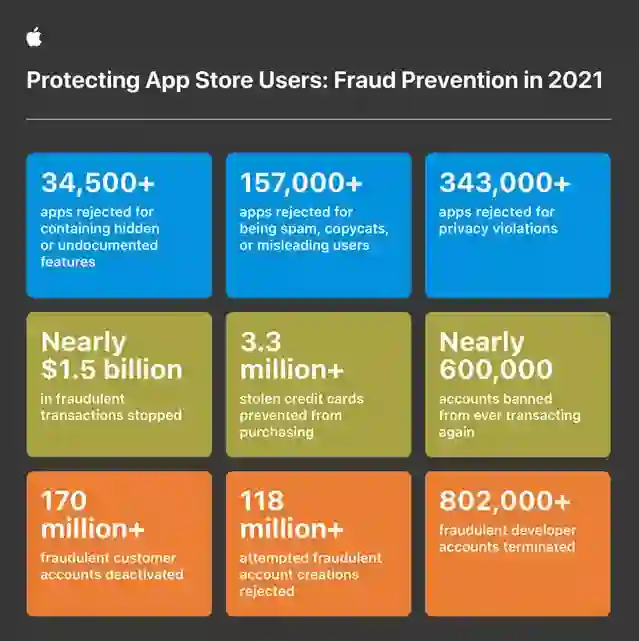 苹果发布了最新的官方报告,报告称 App Store 在 2021 年保护顾客免受总额近 15 亿美元的潜在欺诈交易侵害,阻止了超过 160 万次因高风险或不可信 App 及 App 更新造成的用户欺诈。