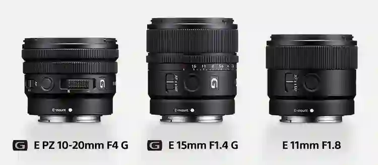 昨晚索尼发布了 E 15mm F1.4 G(型号名:SEL15F14G)、E 11mm F1.8(型号名:SEL11F18)、 E PZ 10-20mm F4 G(型号名:SELP1020G)三支 APS-C 画幅超广镜头,售价 3399 元起。