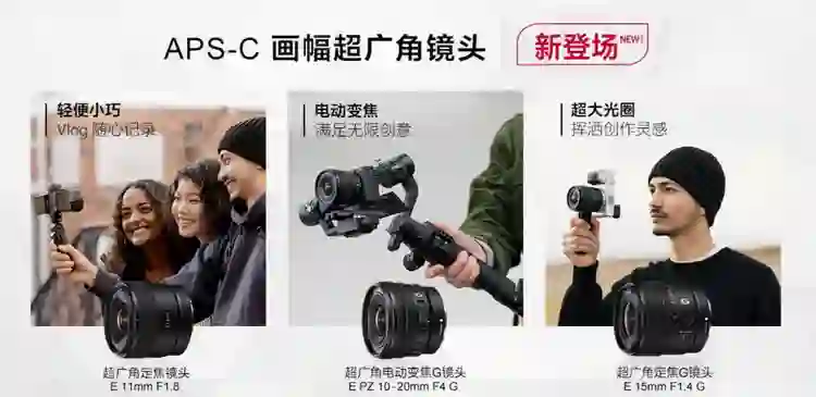 从索尼官方宣传照三支新 APS-C 画幅镜头都是针对 Vlog 创作设计的,只是不知对 Vlog 用户吸引力有多大,毕竟腾龙此前已经推出了 11-20mm F/2.8 Di III-A RXD 镜头。