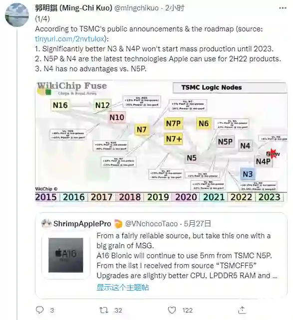 此前,郭明錤放出了一张台积电发布时间的路线图。从图片来看,台积电的 4nm 和 3nm 制程工艺,在 2023 年才会开始量产,这也意味着 A16 处理器将继续使用 5nm 制程工艺。郭明錤表示,与 5nm 相比,台积电的 4nm 制程没有明显的提升,因此 A16 选择 5nm 比较合理。虽然不会升级工艺,但是 A16,将会首次支持 LPDDR5 内存,同时增强 CPU 和 GPU,从而带来体验的提升。