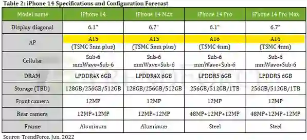 据 TrendForce 发布的消息显示,苹果将在 2022 年下半年推出四款 iPhone 14,其中只有 Pro 机型将配备苹果的最新处理器 A16 芯片。值得注意的是,该报告与天风证券苹果产业链分析师郭明錤的信息一致。2022 年 3 月份,郭明錤表示,只有 iPhone 14 Pro 系列机型将配备 A16 芯片,标准版 iPhone 14 将继续配备 A15 芯片。