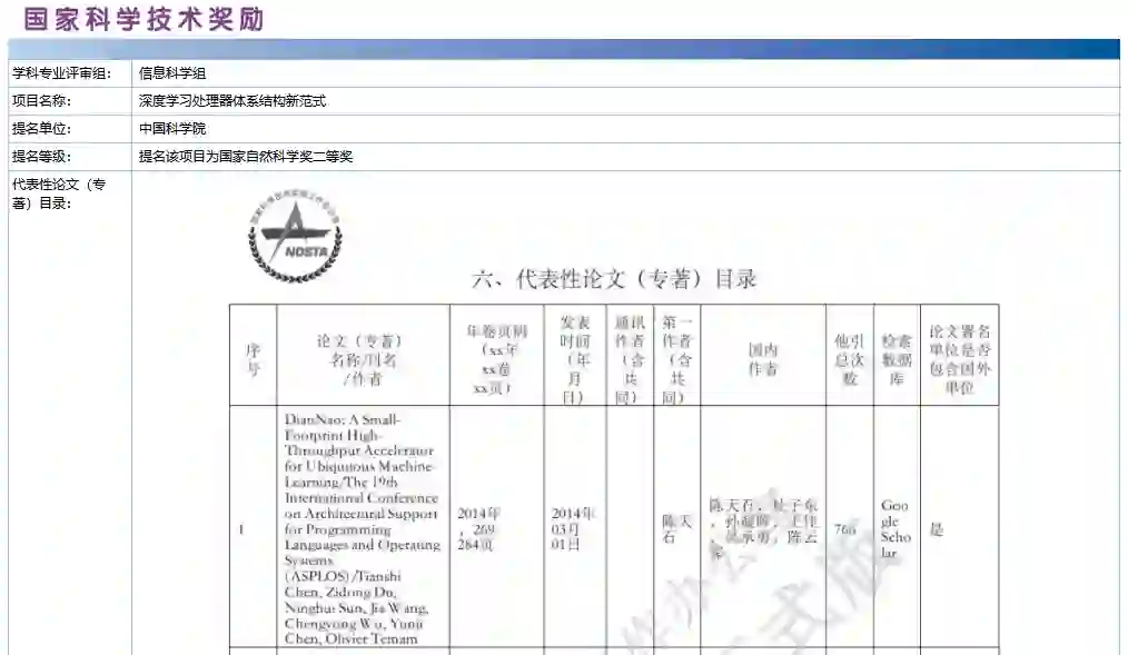 此外,中国科学院提名的《深度学习处理器体系结构新范式》的等级也为国家自然科学奖二等奖,其中陈云霁、陈天石作为主要完成人分别排名第一、第二。