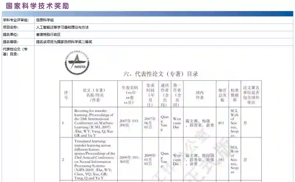 AI科技评论注意到,此次公开的2020年度国家科学技术进步奖受理项目目录,在国家自然科学奖--信息科学组下,在香港特别行政区提交的项目《人工智能迁移学习基础理论与方法》被提名该项目为国家自然科学奖二等奖,其中杨强教授作为主要完成人排名第一,戴文渊排名第二。