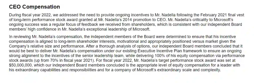 Satya Nadella 和微软的关系也是如此,在微软 2022 年股东签署的委托书上,微软明确表示了“我们设计高管薪酬计划,以吸引、激励和留住推动我们成功和行业领导地位的关键高管,同时考虑个人和公司的绩效以及与股东长期利益的一致性。”