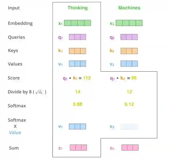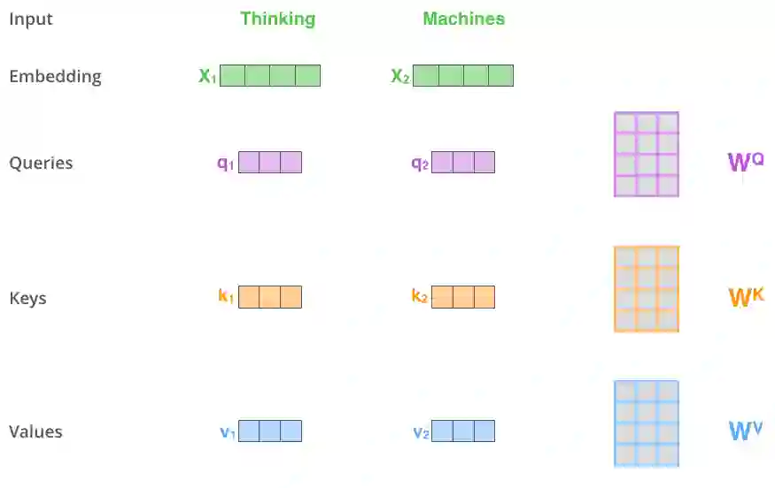 在Scaled Dot-Product Attention中,每个输入单词的嵌入向量分别通过3个矩阵 , 和 来分别得到Query向量( ),Key向量( )和Value向量( )。