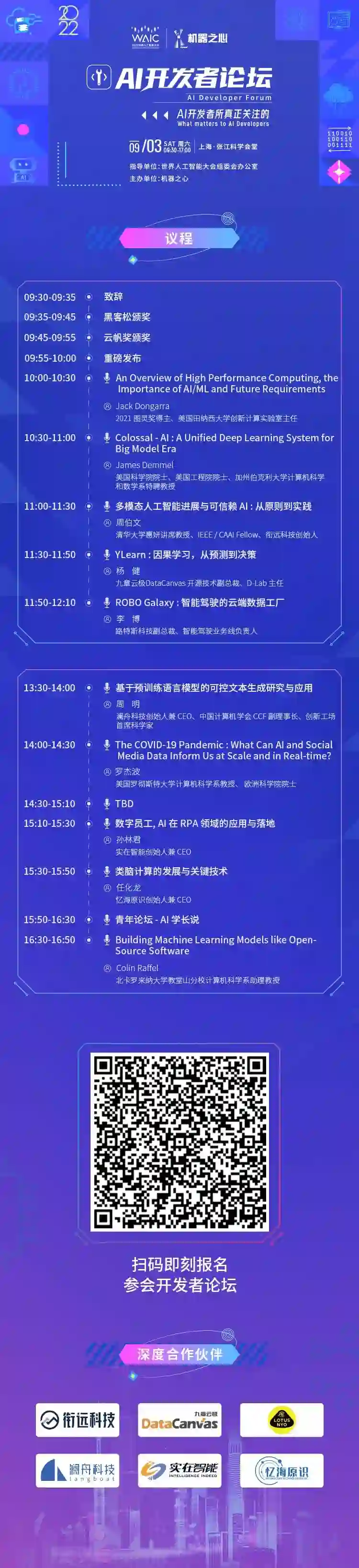 目前,活动主力重磅版块 AI 开发者论坛完整日程已确认,全天论坛包括 2022 年云帆奖颁奖典礼和「WAIC 2022 · 黑客马拉松」颁奖典礼、多项重磅发布、5 场主旨演讲、7 场主题演讲和 1 场青年论坛。