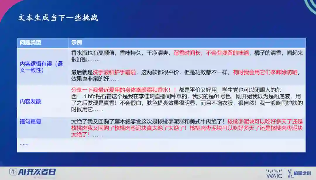 尽管基于预训练的文本生成取得了较大进步,大家看到,有的生成模型生成的文本仍有各种各样的问题,比如内容逻辑错误、内容发散不聚焦、语句重复等等。