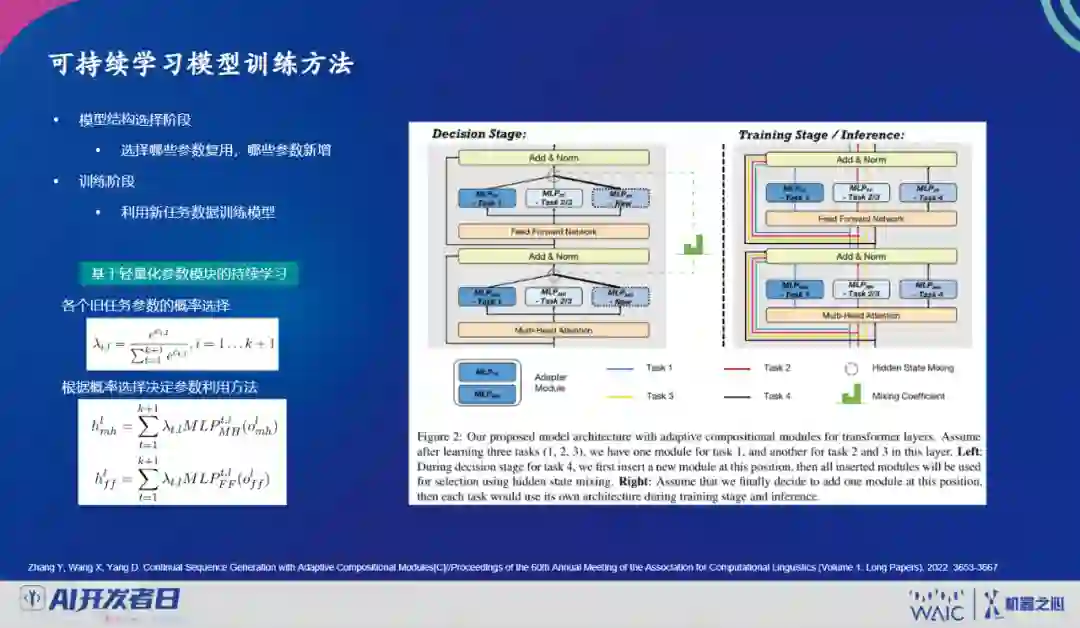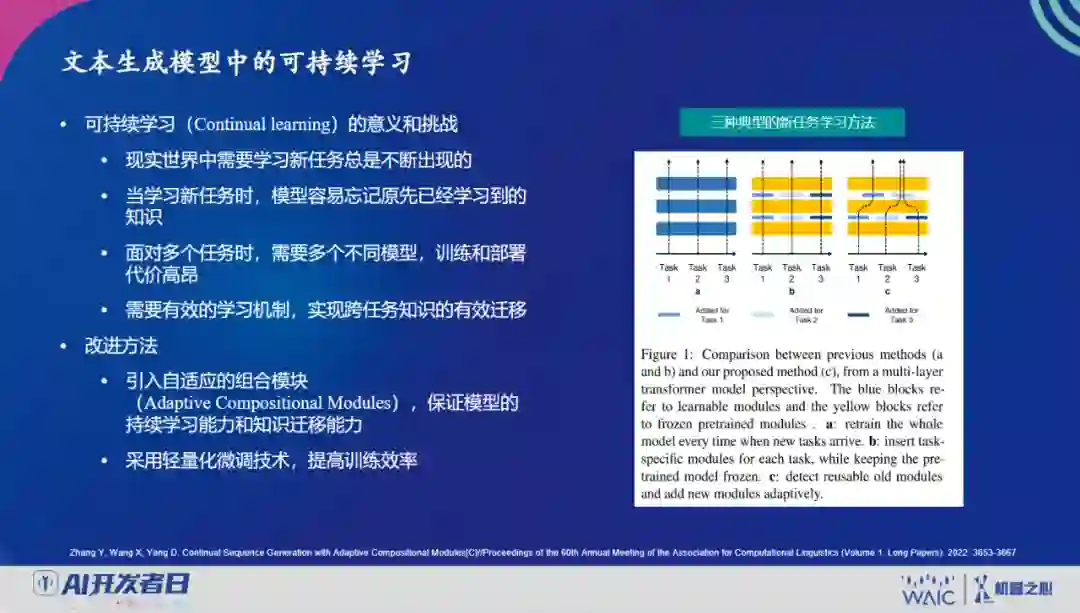 持续学习是什么意思呢?比如,我已经做了一个文本生成,这个文本生成能实现 N 个任务,现在再做一个文本生成实现 N+1 个任务,同时希望任务之间共享一些参数节省训练效率,这是怎么实现的呢?这里就用了可持续学习的方法。