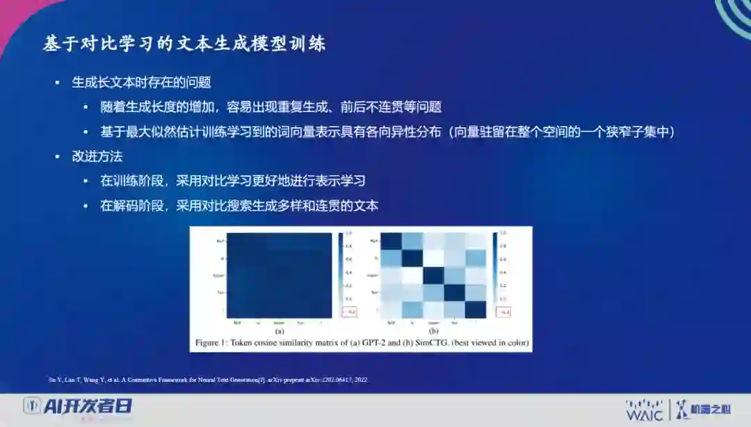 还有一种情况是,在输出的时候总是有重复的词或重复的句子,所以就有人研究使用对比学习方法。这里的对比学习方法意思是,输出的词既要算最大似然,还要跟前面已经输出的词算语义相似度,如果语义相似度特别近则给一个惩罚值。用这个方法就减少了后面的词跟前面的词重复出现的概率。