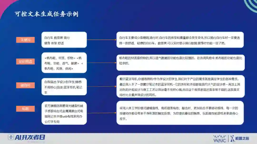 这里给大家看几个例子,可以输入一些关键词或者事实、知识图谱三元组、键值对(比如天气一定是好,房子一定是白色的),再就是标题,然后电脑就可以自动生成我们想要的文本。