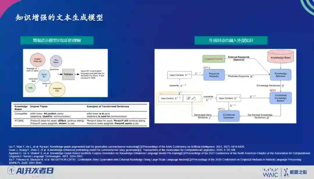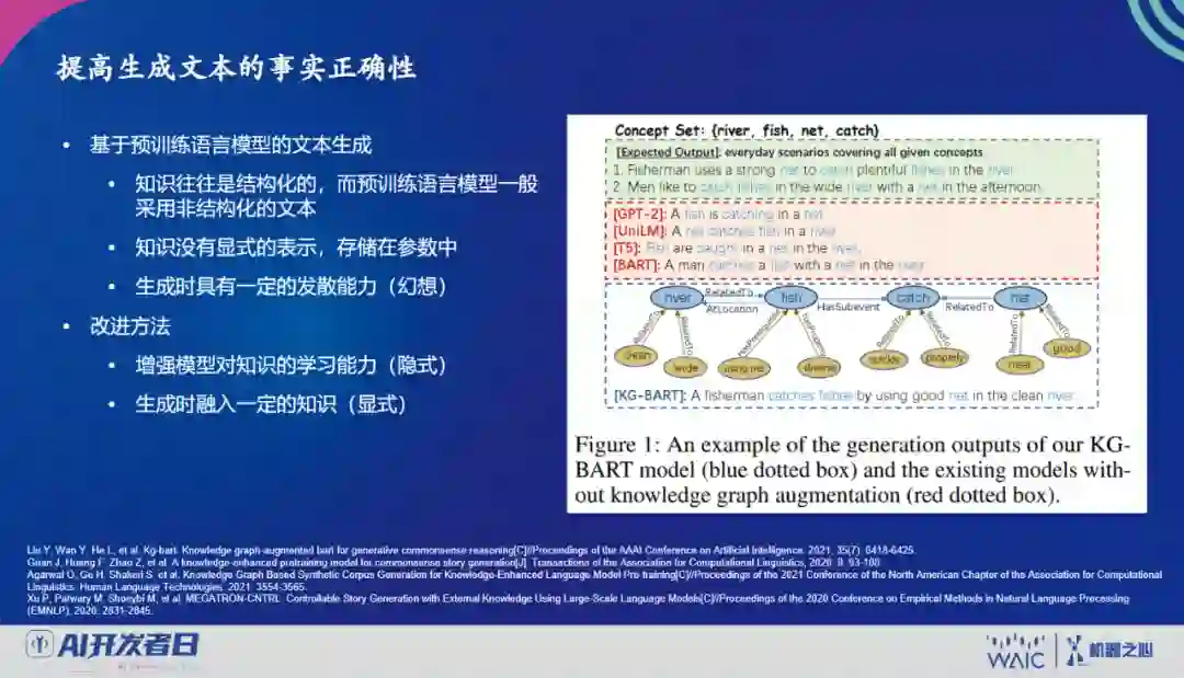 还有一种情况是在生成的时候有知识图谱,如何把领域知识和知识图谱融入在生成过程中,有两种方法可行。第一种方法把这些知识图谱文字化;第二种方法是在生成的时候利用关键词查知识图谱,利用知识图谱拓展输入层,使它生成更多的东西,而每个生成都符合知识图谱。