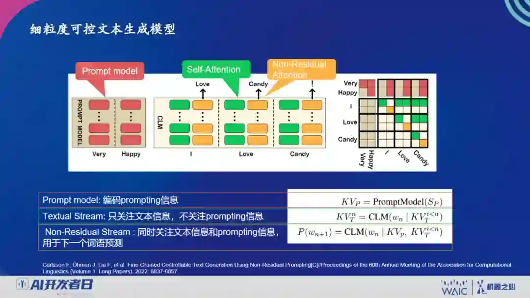 在最近一个 ACL 论文的工作中,研究者提出了细粒度的可控文本生成模型。它有一个 Prompt 网络,把希望可控的部分放在 Prompt 里面,可以是具体的关键词或者写作风格;后面用了一个 GPT,GPT 原封不动,让 GPT 输出文本的表示。为了可控,由于没办法控制 GPT 某一个地方输出你所喜欢的风格,该模型添加额外的一个生成模块,如图中黄色部分,它同时接受 Prompt 网络的输出,加上 GPT 部分的输出,再次作为输入,然后决定下一个词是什么词。这个词决定完了之后,再加入到 GPT 的输出,然后继续生成下一个词。