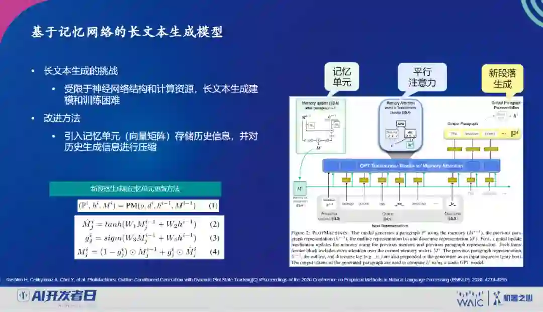 第二个是基于记忆网络的长文本生成模型。长文本在用预训练模型生成时越到后面越发散,同时,太长的文本难以放到 Transformer 中计算,所以就把已经生成好的部分用一个记忆网络存着。这里做了一个改进,引入记忆单元(向量矩阵)存储历史信息,并对历史生成信息进行压缩,将记忆网络的部分当成将要生成内容某种意义上的输入,然后输出的结果就变好了。