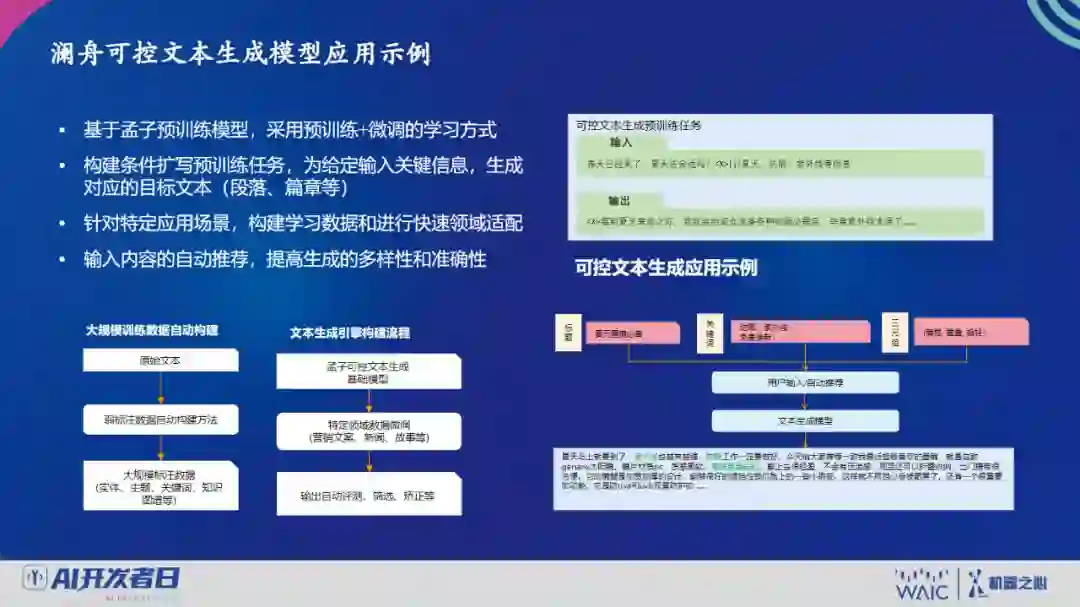 在演讲中,他主要从四个部分进行了介绍:可控文本生成背景、可控文本生成研究进展、澜舟可控文本生成应用实践、总结与展望。说到可控文本生成研究进展,周明总结了三个技术要点:可控文本生成神经网络模型、可控文本生成模型训练与解码、改进生成文本的事实正确性。此外,周明还介绍了澜舟可控文本生成平台,并从应用角度进行介绍,例如基于关键词的内容生成、基于写作模板的内容生成、现代文小说续写等。