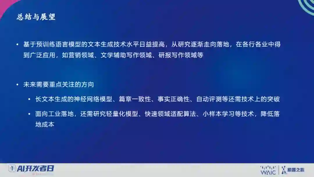 前面快速介绍了文本生成目前的关键技术,总结一下,第一改进细粒度的生成,第二改进长文本,第三改进多样化的问题,还有减少重复出现问题。这都是文本生成领域大家非常关注的问题。我刚才介绍的绝非是最优的方法,只是给大家一个思路。我们在自己做文本生成的时候也受到很大的启发,也开发了自己的思路。