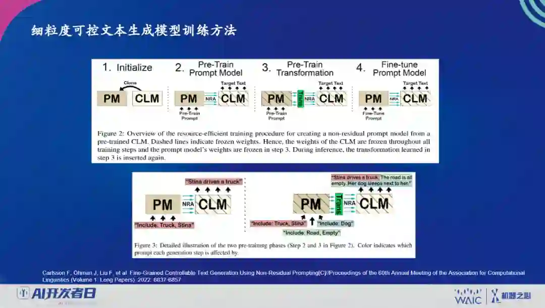 文本生成的任务有很多,但什么是可控文本生成?用 AI 去写,有时候可能不是你要表达的意思,有时想控制一下,例如生成的文本里必须包含如下几个关键词,或者必须体现某种风格;比如说幽默或者欢乐的表达,或者文本使用对象是小孩、老人、男孩、女孩之类。这些关键词、限制信息等各种参数就是可控参数,我们希望电脑生成的文本可以满足这些要求。这样生成文本的方式就是可控文本生成。