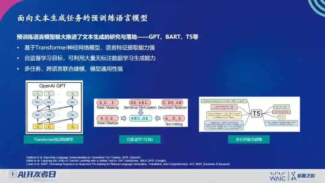 面向文本生成任务的可控文本生成,目前都是用预训练模型来做的,比较常见的有 GPT、BART、T5 等等。预训练模型有时候用海量文本进行自监督学习,有时候用多任务去学习一个语言模型;有的语言模型非常擅长于理解任务,有的非常擅长于生成任务,GPT 之类的模型就比较善于生成任务。