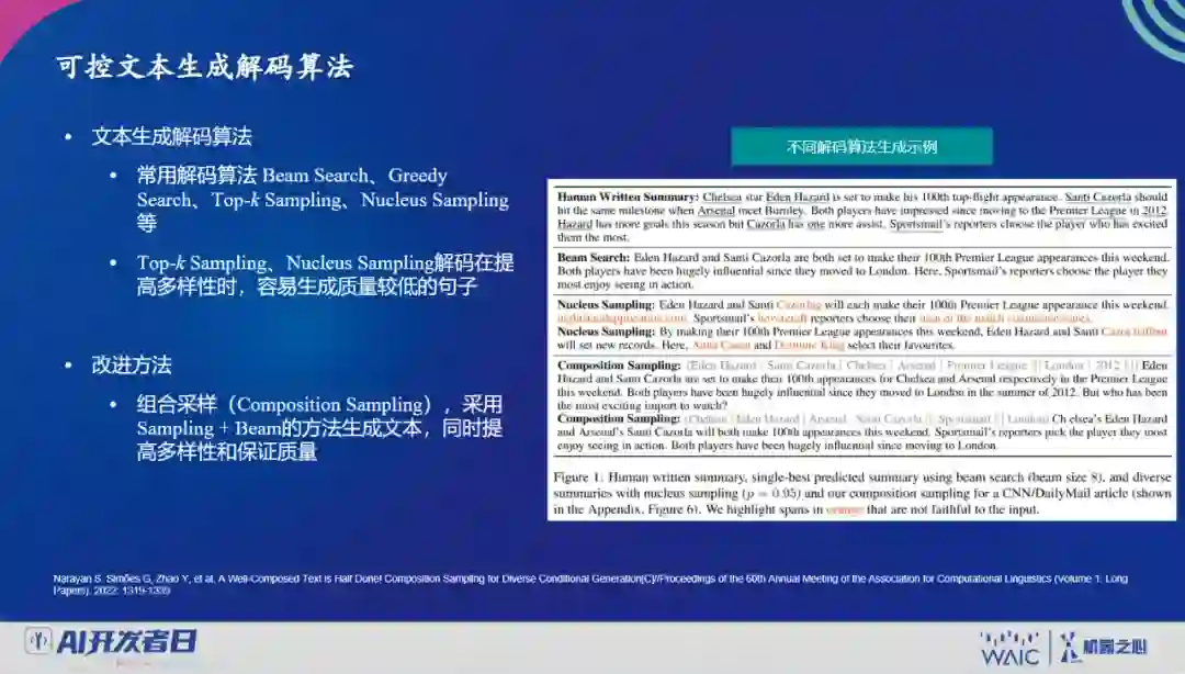 我们总是希望生成是多样化的生成,尤其是在实际应用的时候。比如营销文案生成的时候,我们希望每一次输出多个结果,而且各不相同。这个解码的多样化是非常重要的任务。怎么样来实现解码的多样化呢?Beam Search 用得比较多,可以生成多个结果;然后 Greedy 的话,每次只选第一个词。但是 Beam Search 和 Greedy 每次输出的结果都类似。这里有人提出了一个新的方法——组合采样;就是在输出的时候,先输出若干个关键词作为前缀词来引导输出,输出的关键词就是多样化的,每个多样化的关键词再用 Beam Search,它的多样化就会增加,这样就有效解决了多样化的问题。