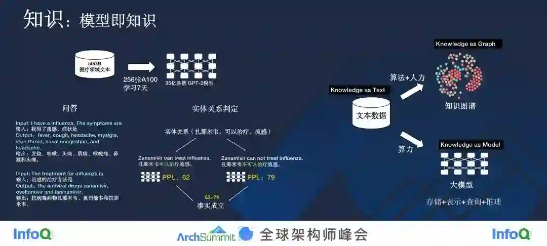 这是一次初步的定量化的实验,而我们在某些关系判定上的准确率可以做到接近 90%。在这个过程中,我们只是把文本灌进去了,没有构建任何的知识图谱。其实,哪怕是知识图谱,准确率想做到 90% 也不是一件容易的事。所以我就提出了下面的一个观点——模型即知识。