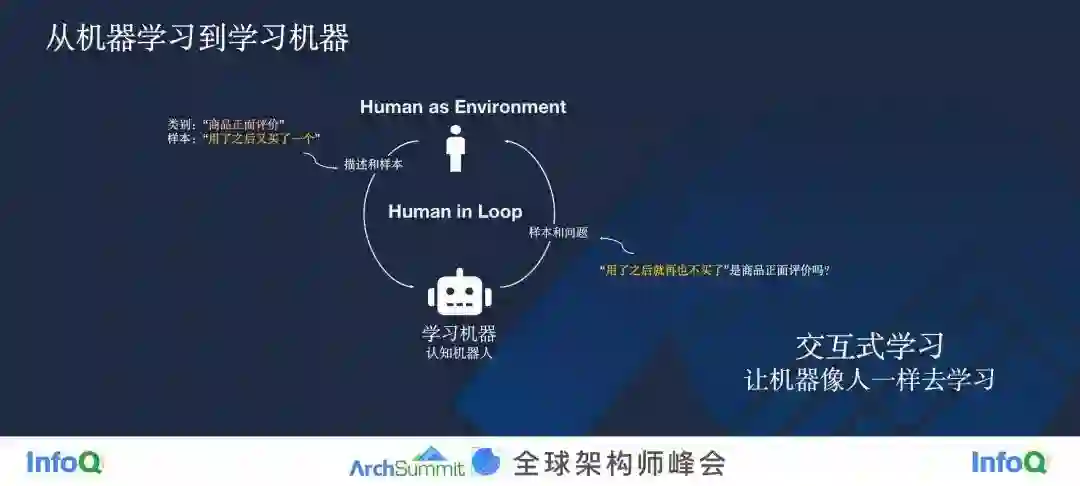 那么,我们站在机器的角度来看,这时候人变成了一个环境,是机器在向人这个环境学习。机器学习算法在表现上倒很像是一个机器人,作为一个 Agent 在跟环境做交互,所以我把它叫做学习机器,甚至我会给它起个名字叫做认知机器人,把这种学习方法叫做 Interactive Learning,交互式学习。